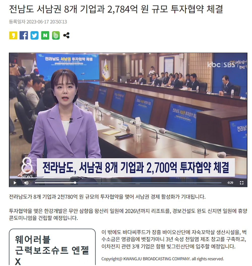 Á¦¸ñ Àü³²µµ ¼­³²±Ç 8°³ ±â¾÷°ú 2,784¾ï ¿ø ±Ô¸ð ÅõÀÚÇù¾à ü°á